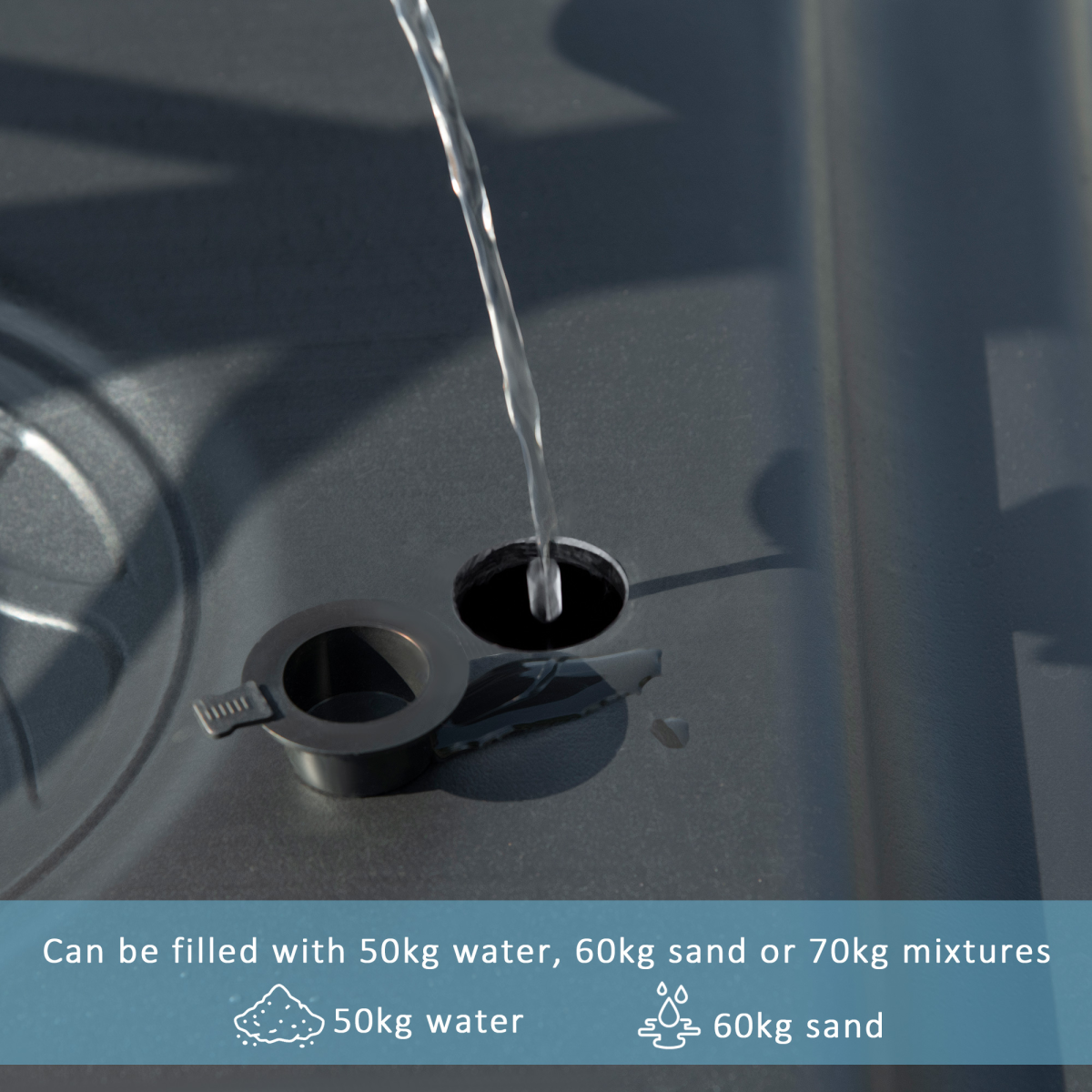 - The base weight is 50kg when filled with water, 60kg with sand, or 70kg when filled with sand and water.