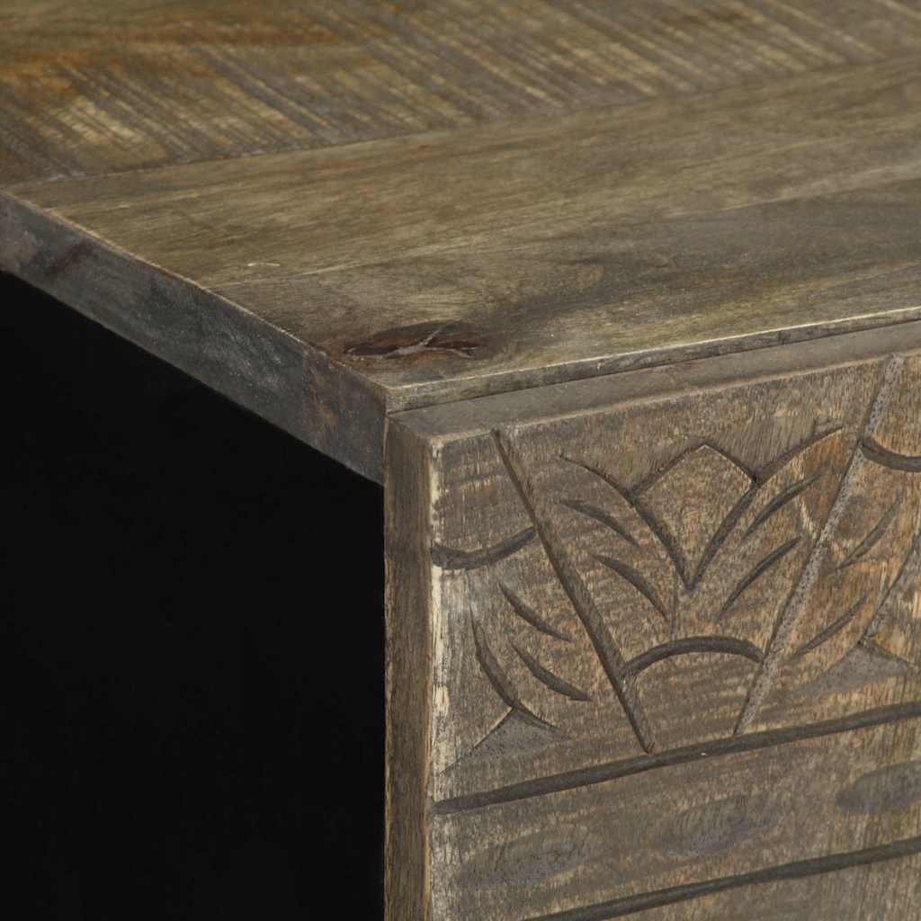 - Material: Solid mango wood with light grey finish, engineered wood, glass