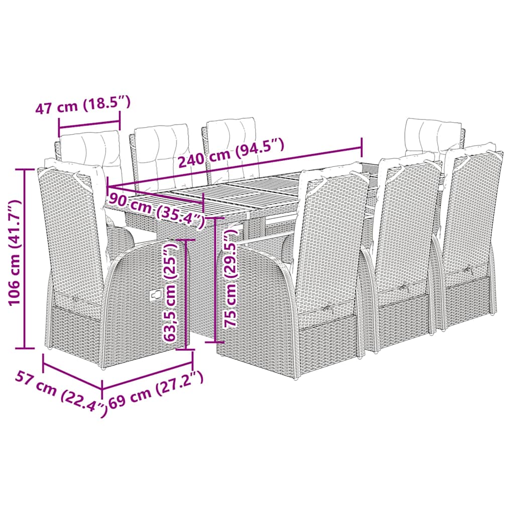 This garden dining set is a great choice for al fresco dining or just relaxing in the garden, backyard, or on the patio. Durable material: PE rattan, also known as poly rattan, is a strong, low-maintenance synthetic material that looks like natural rattan. It's lightweight, easy to clean, and commonly used for outdoor furniture due to its durability and weather-resistant properties.Adjustable backrest and footrest: This garden seat has a handle. You can adjust the backrest and footrest to any position by pulling the handle, and quickly return it to its original position.Comfortable seat experience: This outdoor furniture, complete with thickly padded cushions, offers a comfortable seating experience.Removable and washable cover: These seat cushions feature removable covers for easy washing and maintenance.Stable and easy-to-clean tabletop: This garden table has an acacia wood top that is sturdy, durable, and easy to clean with a damp cloth. Good to know:To make sure your outdoor furniture stays beautiful, we recommend protecting it with a waterproof cover.