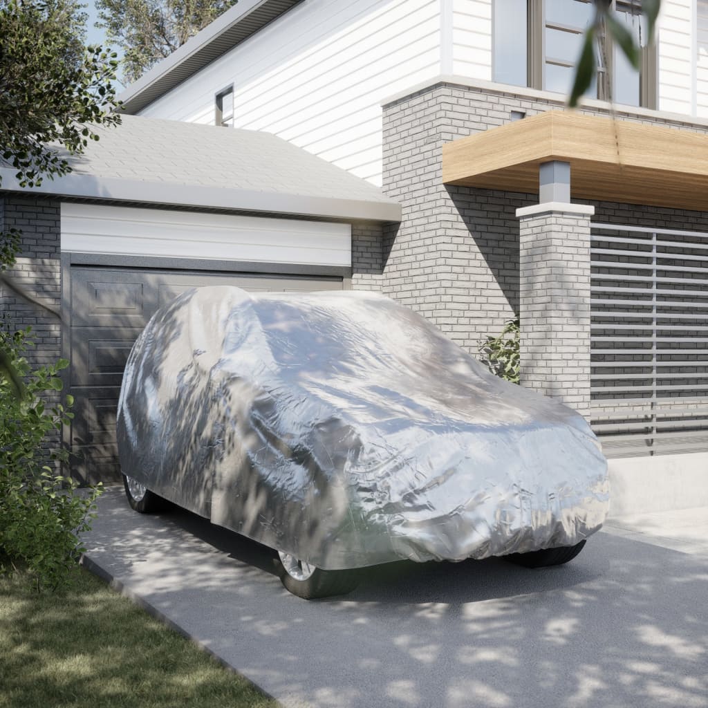 This car cover for SUV protects your vehicle against UV rays, snow, rain, frost, dust, fallen leaves, industrial pollution, and bird droppings, making it ideal for indoor and outdoor use. All-weather protection: This car cover is made from breathable polyester with a PU coating, ensuring it is waterproof and UV-protective for year-round protection. The double-stitched seams enhance its strength and durability.Silver coating for heat insulating: The silver surface of the car cover reflects more sunlight and UV rays, keeping your car cooler in hot weather. This helps protect your car's interior from heat damage.Windproof design: The elastic edges of the cover ensure a snug fit for your car, while the adjustable straps with buckles at the bottom keep it secure, even on windy days.Easy storage: This car cover comes with a convenient storage bag, making it easy to store when not in use. Good to know:Before purchasing, please take precise measurements of your car to ensure you select the correct size.