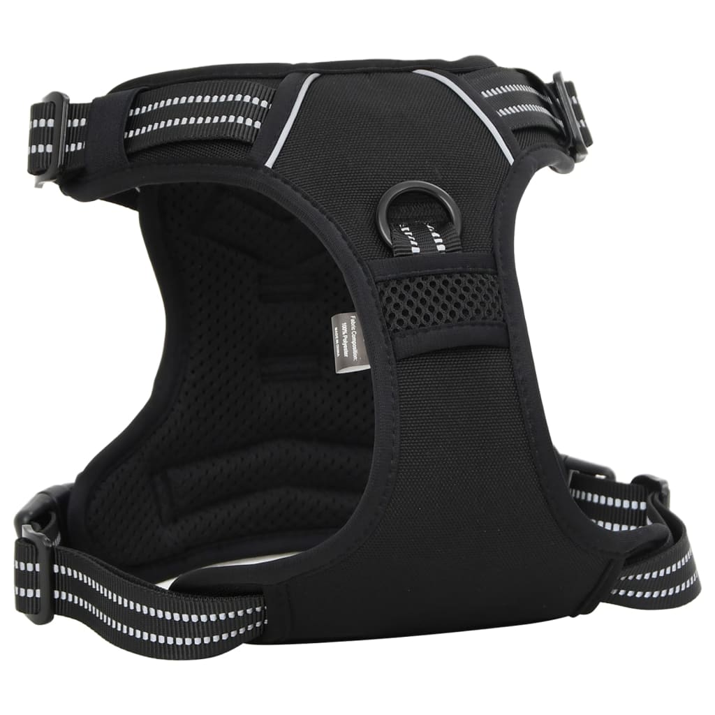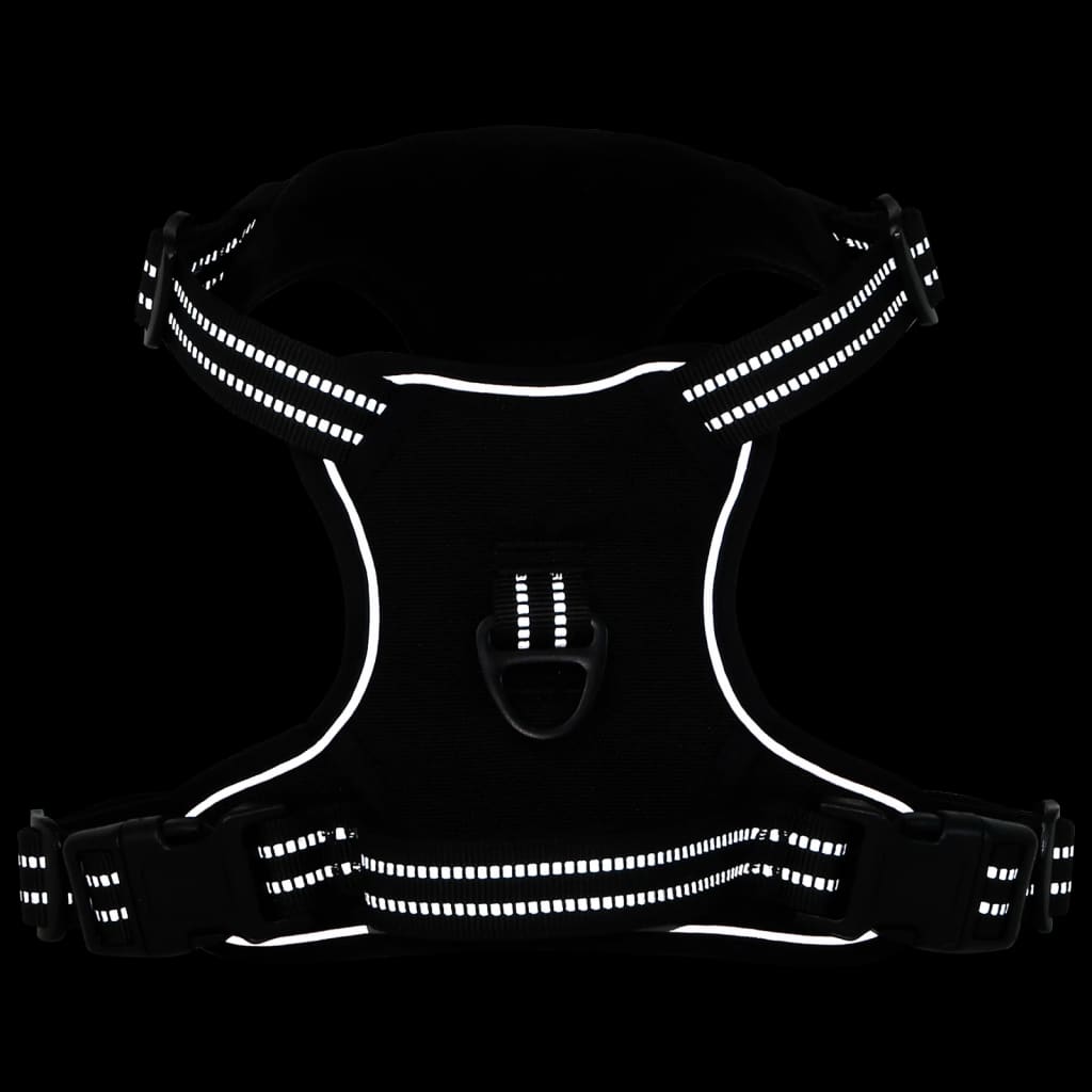 Say goodbye to pulling and hello to better control with our easy-to-use dog harness. Give your furry friend the best walking experience! Easy to put on and take off: This dog harness is easy to put on and take off with its 2 quick-release buckles. Simply slide the harness over your dog's head, fasten the buckles, adjust the straps, and you're good to go!Fully adjustable: This dog harness has 4 adjustable straps for a perfect fit. Customise the 2 neck and 2 chest straps for comfort and room to grow! Your dog will stay secure without slipping out or feeling choked, thanks to the even distribution of pulling force across their body.No Pull & No Choke: This dog harness has two leash rings for safer dog walks. Use the front clip to stop pulling during training, while the back ring is great for everyday walks, jogging, hiking, and more.Safe and comfortable: This dog harness is made of polyester and padded with a soft cushion to protect your dog's skin. Also, the breathable air mesh keeps your dog cool and comfy all day.Reflective strips for high visibility: This dog harness features reflective strips on its surface, ensuring a safe walk both day and night. Good to know:This product is suitable for machine and hand washing, for best results and to extend its lifespan, hand washing is recommended.