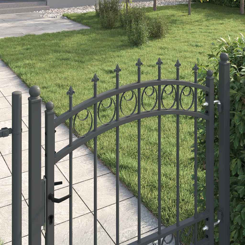 This elegant fence gate adds both functionality and modern aesthetics to any outdoor space. Tailor-made for garden and terrace areas, it combines a timeless design with security. Constructed from durable powder-coated steel, this Rectangular gate is not only robust and weather-resistant but also aesthetically pleasing, enhancing the overall look of your premises. The arched top design with its sleek spikes provides a statement of style, while maintaining the necessary safety and division in your garden. Powder-Coated Steel: Built with high-quality powder-coated steel, the gate withstands various weather conditions, ensuring longevity and minimal maintenance. The durable finish prevents ,bumps, or scratches, making it perfect for continuous outdoor exposure. Secure Deadbolt Locks: Featuring deadbolt locks, this gate offers heightened security, ensuring your garden remains safe from unwanted access. The locks are robust, requiring a key for operation, which gives you peace of mind in knowing your outdoor space is secured. Arched Top Design: The elegant arched top enhances your garden’s visual appeal. This design, coupled with decorative spikes, adds a modern touch to any landscape, creating an inviting entrance that is both functional and stylish. Complete Set: Delivered with everything needed, including two sturdy posts, strong hinges, and three matching keys. This complete set simplifies assembly and assures stability upon installation, allowing you to achieve the finish you desire quickly and effectively. Care &Maintenance: Easy to maintain, this gate only requires an occasional wipe with a damp cloth, keeping it looking pristine and fresh, without the need for rigorous care routines. Such low maintenance supports long-lasting aesthetics and function.