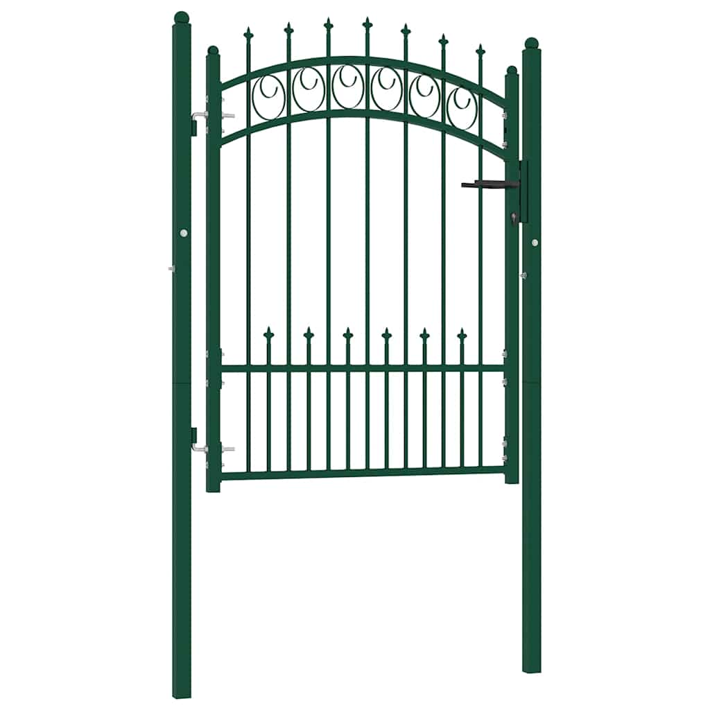 This fence gate forms a practical security barrier for your garden, patio or terrace. Manufactured from heavy-duty steel, the fence gate has a sturdy construction and has been powder coated against rust and corrosion. With the vertical bars featuring spikes and strong horizontal brace as the reinforcement, this garden gate provides a high degree of security. The arched top design adds to its elegance. It comes with two solid posts along with sturdy hinges for easy installation, and a locking system with three matching keys is also included in delivery.