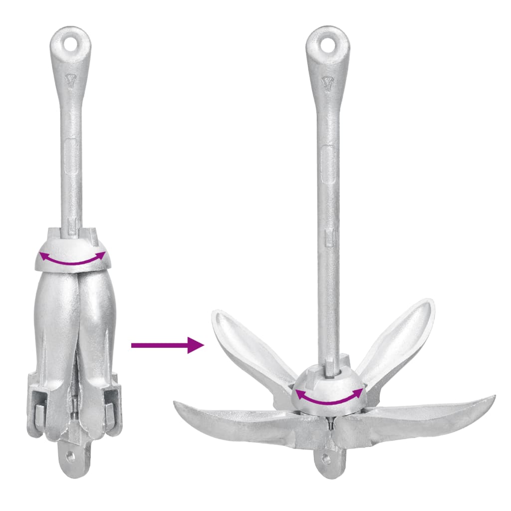 Make your journey on the waters more effortless with the folding anchor. Robust material: Made of hot dip galvanized cast iron, the anchor is durable, wear-resistant, corrosion-resistant and can be used for a long time.4-claw design: The grapnel anchor's 4 claws have good contacts with the ground such as sand, grass or mud that makes your watercraft stay in place, providing you with a secure and safe experience.Twist lock: This twist lock keeps the flukes stable in the unfolded position in no time. Additionally, the anchor rope or anchor chain can be easily attached to the eyelet.Portable anchor: Thanks to its foldable function and compact size, the boat anchor is easy to store and carry. You can quickly pack it in your backpack or boat bag and take it with you on your next water adventure.Wide application: The grappling anchor is suitable for a variety of small boats such as sailboats, dinghies, fishing boats, kayaks, canoes and paddle boards.