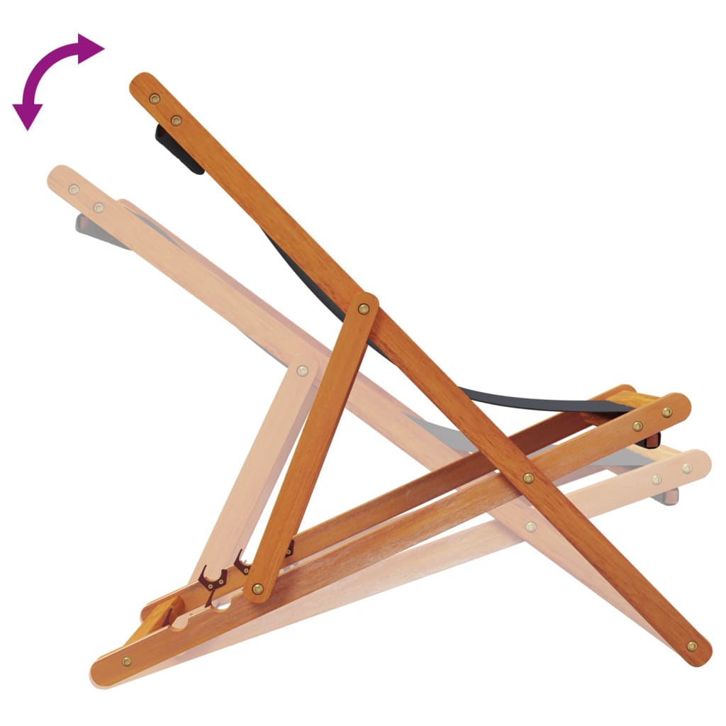 Relax in these reclining chairs on the beach, campsite, or in your garden! Made of solid eucalyptus wood and polyester fabric, the folding beach chairs are weather-resistant and very durable. Durable fabric: The fabric features a simple and clean look while remaining breathable and long-lasting.Sturdy frame: These lounge chairs are constructed with a wooden frame, which ensures sturdiness and stability.Adjustable and foldable design: The camping chairs can be adjusted in 3 reclining settings for optimal comfort. Additionally, the beach chairs can be folded for easy transport and storage when not in use.