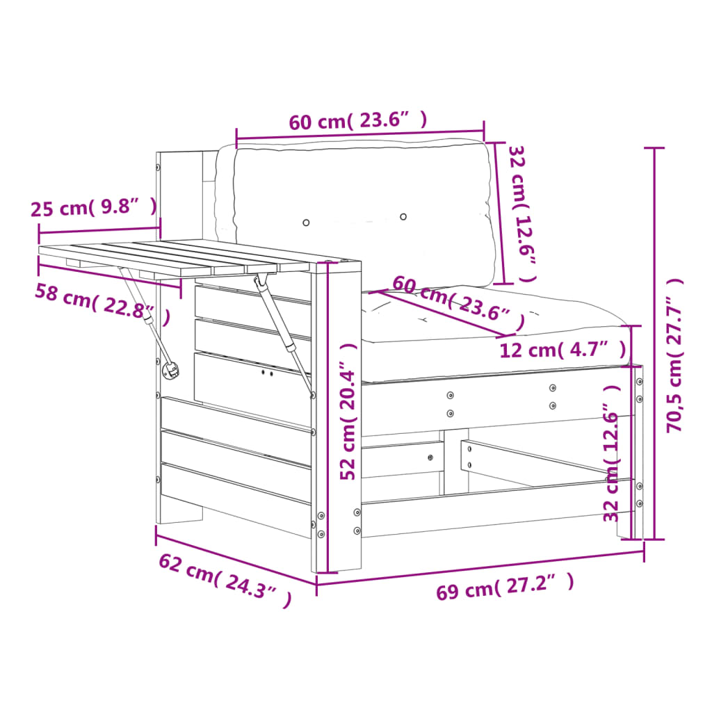This wooden garden sofa with cushion will make a great addition to your garden, terrace, or patio for chatting with family and friends or just enjoying the weather. Solid pine wood: The garden seating is made of solid pine wood for sturdiness and stability. Solid pine wood is a beautiful natural material. Pine wood has a straight grain, and the knots give the material its signature, rustic look.Comfortable seat experience: The backrest and the cushions make the garden sofa chair more comfortable to sit on.Convenient side table: This outdoor furniture features a foldable side table with a gas spring on the armrests, providing a convenient spot to keep your essentials within easy reach.Slatted design: The slatted design of the wooden garden chair prevents water accumulation, keeping the seat dry and preventing unnecessary rotting.Modular design: The sectional sofa is flexible and easy to move around. You can combine it with other modular segments available in the drop-down menu to create your own personal garden lounge set configurations!Wide applications: The garden armchair is perfect for any front porch, patio, backyard, lawn, garden, etc. Good to know:To make sure your outdoor furniture stays beautiful, we recommend protecting it with a waterproof cover.