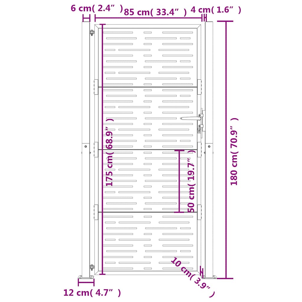 This garden gate, featuring a perfect combination of strength and elegance, makes an ideal entry point for the fence around your garden or patio. Heavy-duty construction: This fence gate is made of corten steel. Corten steel, also known as weathering steel. This is anti-corrosive by its very nature. It develops a rusty protective layer against corrosion when first exposed to atmospheric conditions. Thus, you don't need to paint it. This can help you save on maintenance and repair costs. The distinctive brown colour on the corten steel will surely be an eye-catcher. Finally, weathering steel is exceptionally durable and will stand up to the test of time.Laser-cut design: The security gate has a beautiful laser-cut design that adds a unique charm to your home.Lockable system: The outdoor gate is equipped with a lockable system for extra security.Easy to assemble: The entrance gate comes complete with two posts with flange plates and mounting accessories for easy installation. Good to know:This product is not rusted yet and has a normal metal colour when you receive it, but rust will develop over time. You could speed up the rusting process by spraying it with soap water and salt water. To keep your clothes stain-free, avoid contact with the developing rust layer.