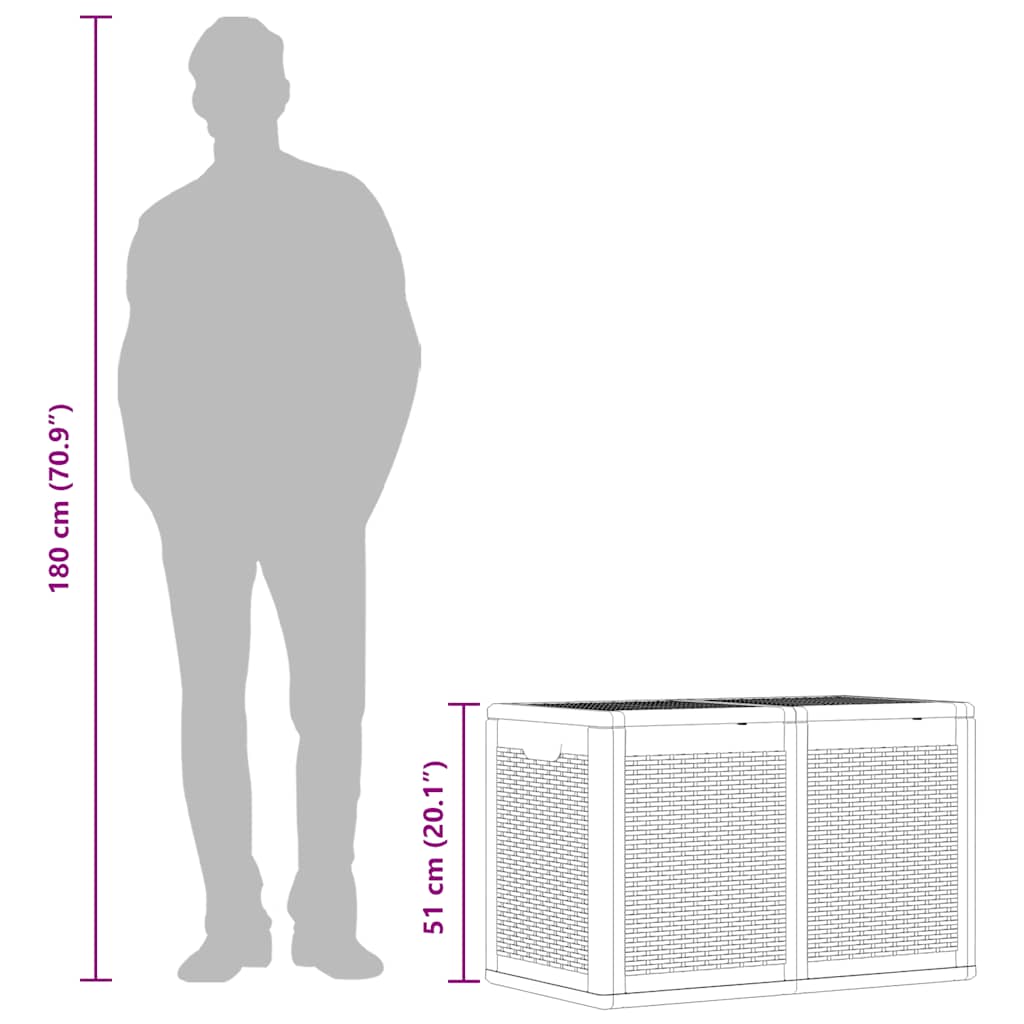 This simple storage box is an excellent solution for decluttering your garden, patio or terrace. The storage chest is made of 100% PP material, making it weather-resistant, UV-resistant, lightweight and easy to move. The garden storage box features an understated yet timeless design and blends perfectly with your indoor and outdoor decor. In addition, the garden storage box offers ample storage space for cushions, pillows, other household or garden items within reach. Note: In order to extend the life of your outdoor furniture, we recommend you to clean it regularly and do not leave it outdoors without protection unnecessarily.Clean: Use a mild soap solution.Storing: If possible, store in a cool, dry place indoors. If the product is stored outdoors, protect it with a waterproof cover. Wipe and dry the excess water or snow from flat surfaces after a rain or snowfall. Allow sufficient air circulation to avoid moisture-related damage.