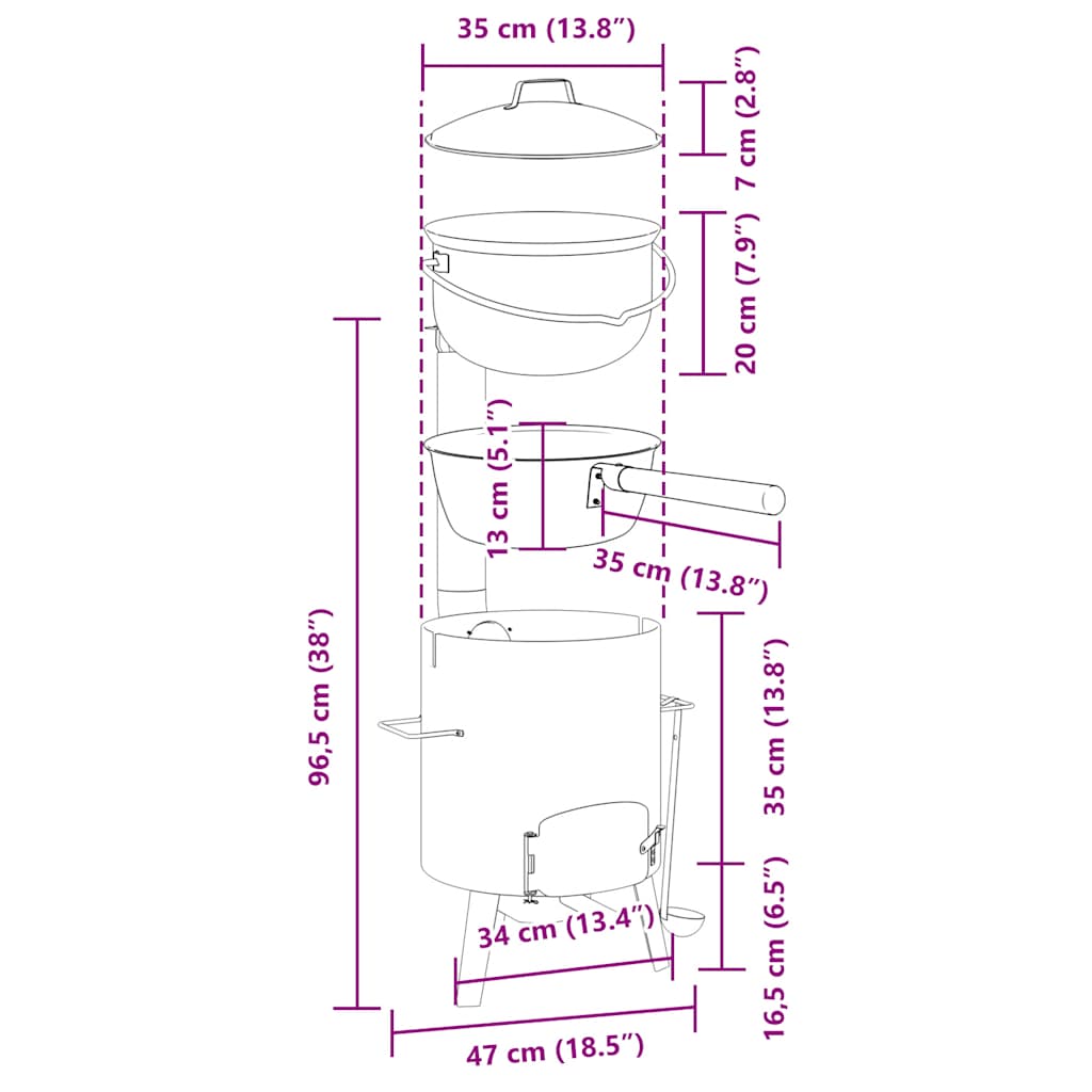 This goulash cannon, including essential accessories, is perfect for garden parties, outdoor kitchens, festivals, camping and more! Elevate your outdoor cooking experience with this convenient goulash cannon set! All-rounder for outdoor cooking: Whether you want to make a hearty pea soup, flavorful chilli con carne, traditional Hungarian goulash, or warm punch or mulled wine, this goulash cannon has you covered. Also, the included perforated pan makes grilling steak or cooking crispy chicken a breeze.Convenient to use: Simply fill the large combustion chamber with wood, charcoal, or coal to get started! The integrated fire flap allows you to regulate the air supply and makes it easier to add fuel.Easy to clean ash: This outdoor fire oven has a practical ash container for clean operation. The container collects burnt ash through several holes at the bottom, preventing blockage of the combustion chamber.Smoke-free: The extra-long chimney pipe, equipped with a rain cover, effectively and safely draws smoke and fumes away from the hob.Lightweight and easy transport: With its lightweight design and two side handles, you can effortlessly transport the outdoor oven anywhere.