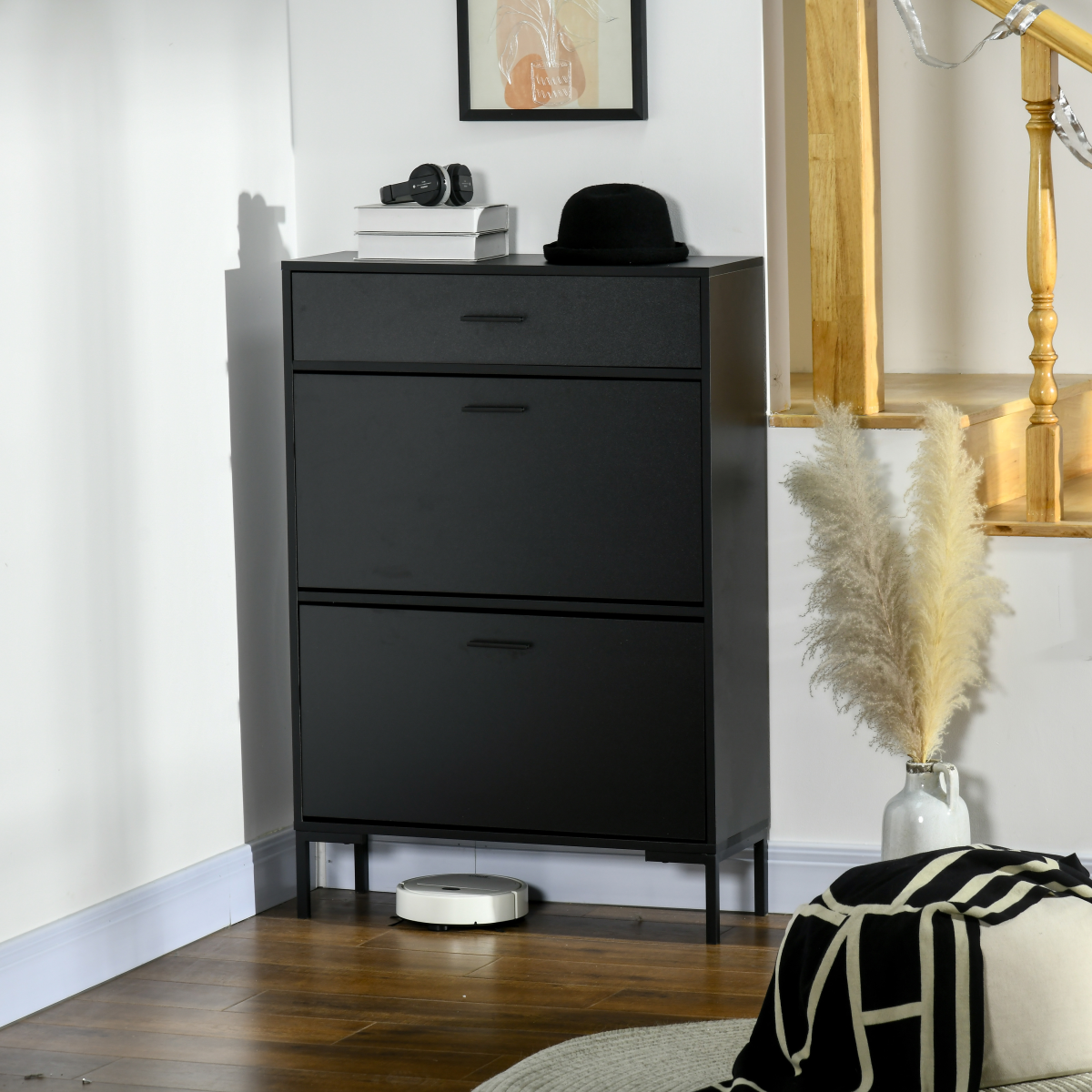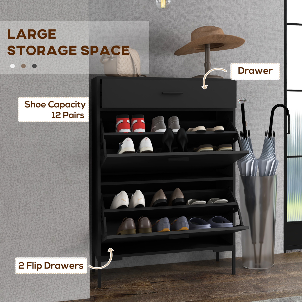 ● Two flip drawers hold up to 12 shoe pairs of shoes, maximum size UK 9.5