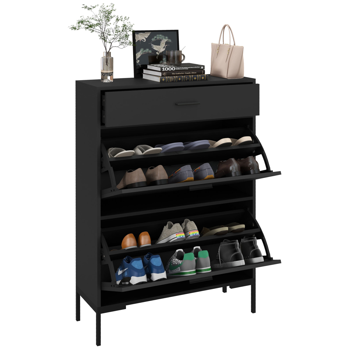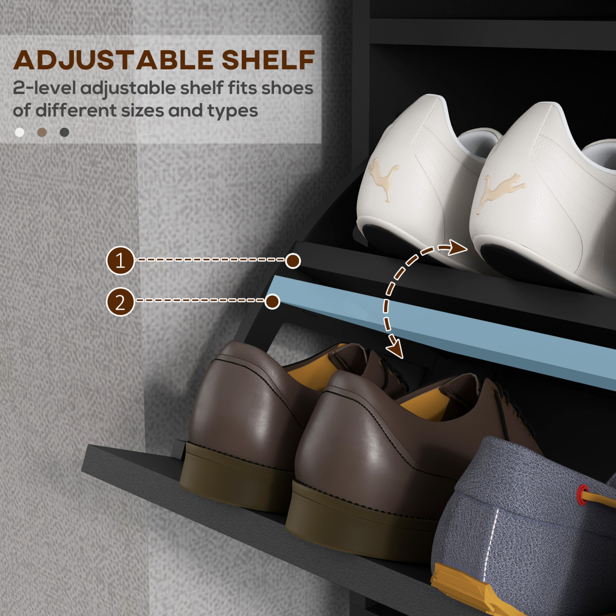 ● Two-level adjustable shelf in each flip drawer offers flexible shoe storage