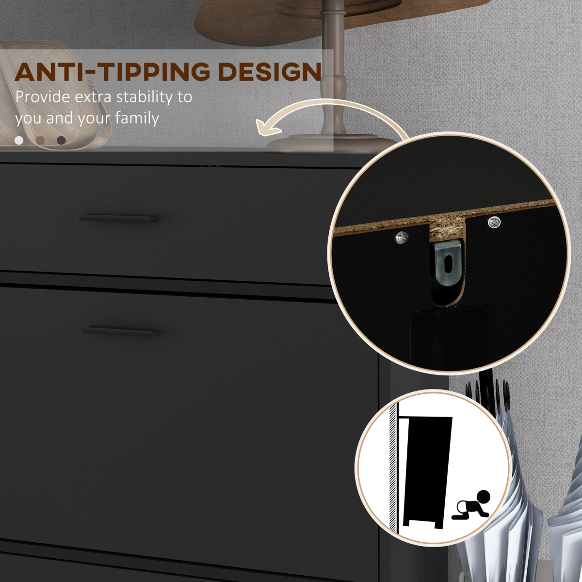 ● Anti-tipping straps to fix hallway storage unit to a wall