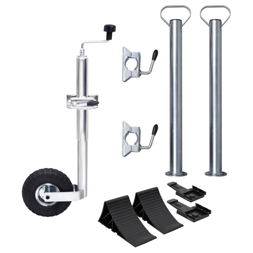 This jockey wheel contains the necessary accessories to ensure the proper parking of your trailer and increase your safety when loading and unloading. Jockey wheel: Made of high-quality galvanised steel, this jockey wheel is rust-resistant and robust with a maximum load bearing capacity of 150 kg, which makes it suitable for use with small to medium trailers and caravans. The solid rubber wheel helps to easily move around your trailer when the jockey wheel is attached.Stable support tubes: These support tubes are made of high-quality galvanised steel which is rust-resistant and robust. They are used for added stability to ensure safe and reliable support for your trailer.Practical split clamp: The split clamp is equipped with a rubber grip on the end of the handle for easier manoeuvring. Simply screw clockwise or anti-clockwise to open or close the clamp. It is easy to open for quick removal of prop stands and jockey wheels, making your setup and dismantling process smooth and efficient.Wheel chocks: The clever design of these wheel chocks helps the wheel blocker slot into an angle with great ease. Also, the ribbed top surface allows wheels to grip on for a prolonged time, which allows you to keep the car stable for ultimate safety.
