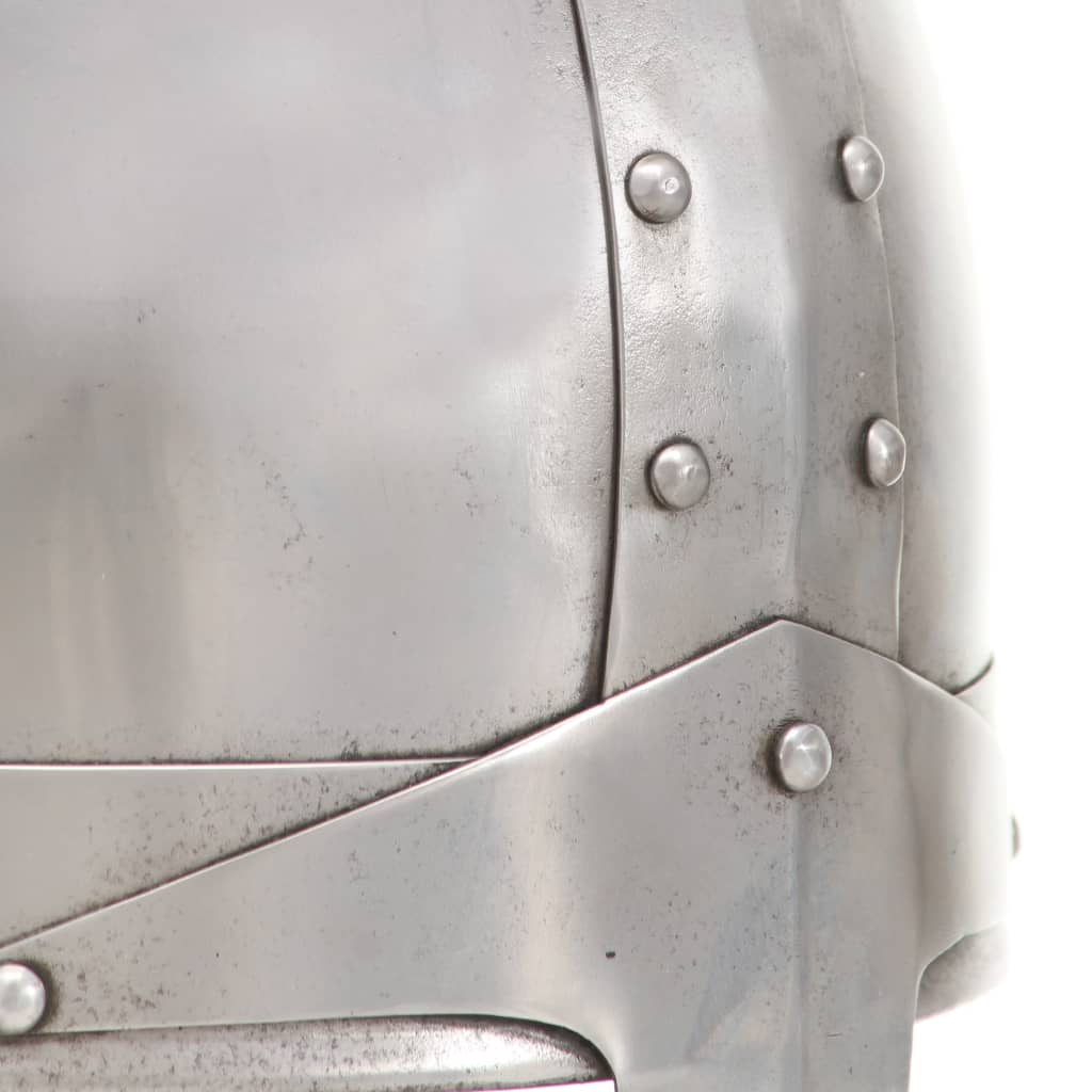 This antique looking armour helmet is excellent for LARP (live action role play), cosplay, parties with a historical theme, Halloween party, theatrical props and historical reenactments. The armour helmet is an exact replica of an original European Nasal helmet. Made of 18-gauge steel, it combines antique style and sturdy material into an eye-catching helmet, which perfectly matches with your knight outfit. Our Norman helmet is also designed to protect your nose well. Additionally, it is an attractive display piece.