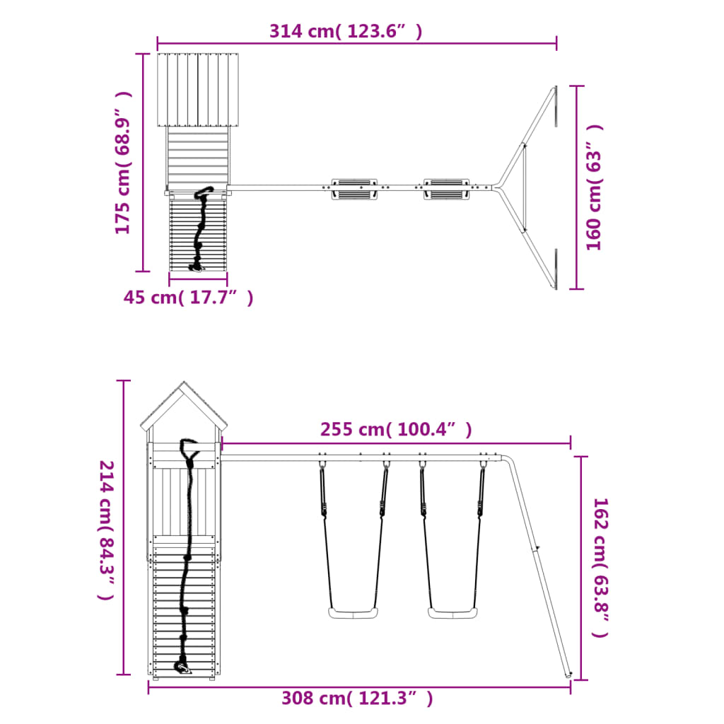 Do you want to give your children the freedom to play at home? This wooden outdoor playset transforms your backyard into a playground for imaginative adventures! Impregnated wood: This garden climbing frame is made of vacuum pressure impregnated pinewood. Solid pine wood is a beautiful natural material. Pine wood has a straight grain, and the knots give the material its signature, rustic look. Impregnation is a preservation process that is carried out by using autoclaves. The pressure-treatment increases resistance to decay and weather.Sturdy and stable frame: The wooden frame of the garden climbing frame ensures sturdiness and stability. In addition, the "A" shaped legs of the children's swing allow for balance.Multi-activity centres: The climbing frame features a 90 cm height platform and stands out with its climbing wall with a rope, double swing set, and sandpit. Your little ones can also invite their friends to join the fun.Thoughtful design: The surrounding wooden railings are designed to ensure the safety of children during their happy play. Also, the wooden roof provides shade for your children on hot summer days.Endless fun: This fun-filled wooden outdoor playhouse is the perfect way for your children and their friends to enjoy entertainment, have more interactive time and make memories for you and your children! Warning:Only for domestic useOutdoor useNot suitable for children under 3 yearsRecommend user age: 3-8 years oldMaximum per user weight: 45 kg Good to know:To make assembly as easy as possible, each product is delivered with a manual.