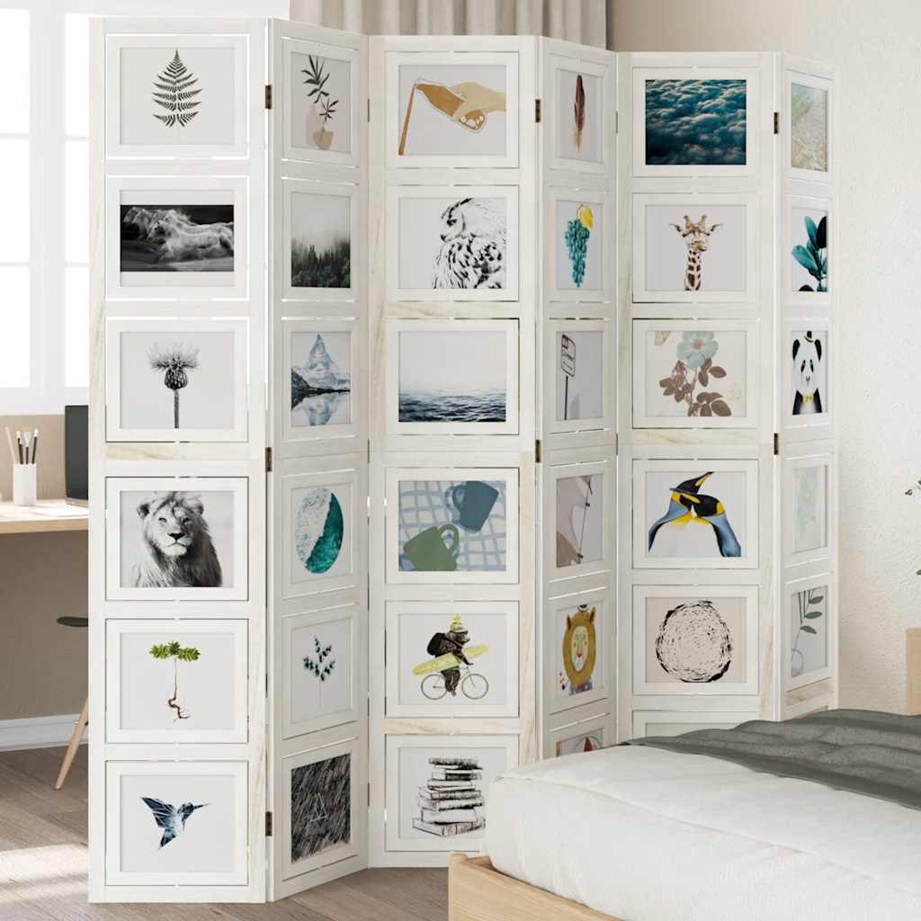 Bring elegance and an eye-catching decorative touch to your space with this charming room divider. Durable and easy to clean: The privacy screen is made from solid paulownia wood, making it easy to clean and durable. The solid paulownia wood frame ensures sturdiness and stability. Solid paulownia wood is a beautiful natural material. Paulownia wood is highly resistant to bugs and rotting.Flexible and easy to fold: Each partition is connected by 3 metal hinges and the upper and lower panels are connected by hidden 2-in-1 hinges. So the room divider panel can be easily folded to some extent according to your needs to save space.Attractive design: Each photo frame can be rotated vertically, allowing you to arrange your favourite photos in any position, becoming the highlight of the room.Multipurpose: The room partition is great for creating private space in your bedroom, living room, office and other interiors. You can also place it in front of a window to block intense sunlight. Warning:Only for indoor use. Good to know:Each swivelling frame features an open design and does not come with pre-set decorative pictures and glass. You can personalise it by inserting photos through the opening on the side of the frame to create a unique, customised look.