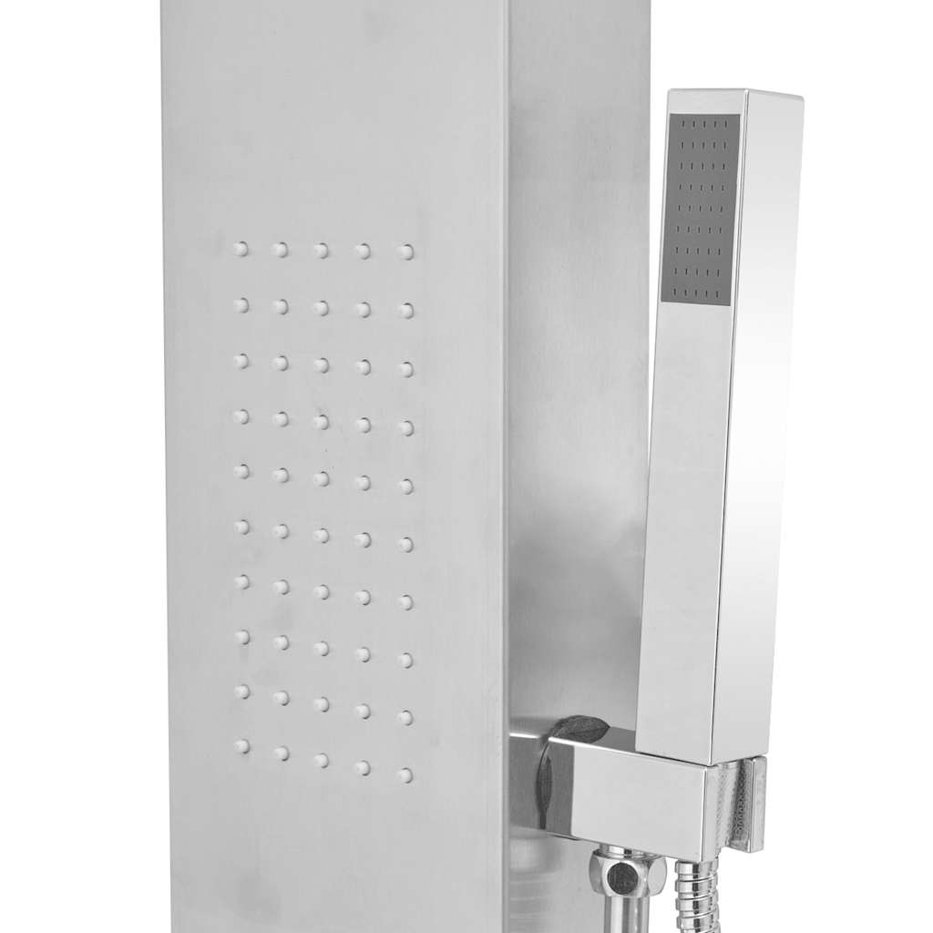 This multifunctional shower panel system has a stylish design and will make a great addition to your bathroom. The shower tower is made of durable stainless steel with a brushed finish and has a beautiful, square design. It has four functions: rainfall, waterfall, massage jets and a handheld showerhead, which can be easily selected by means of a knob. Immerse yourself in a truly relaxing shower experience and enjoy the modern style of this beautifully designed shower panel system!