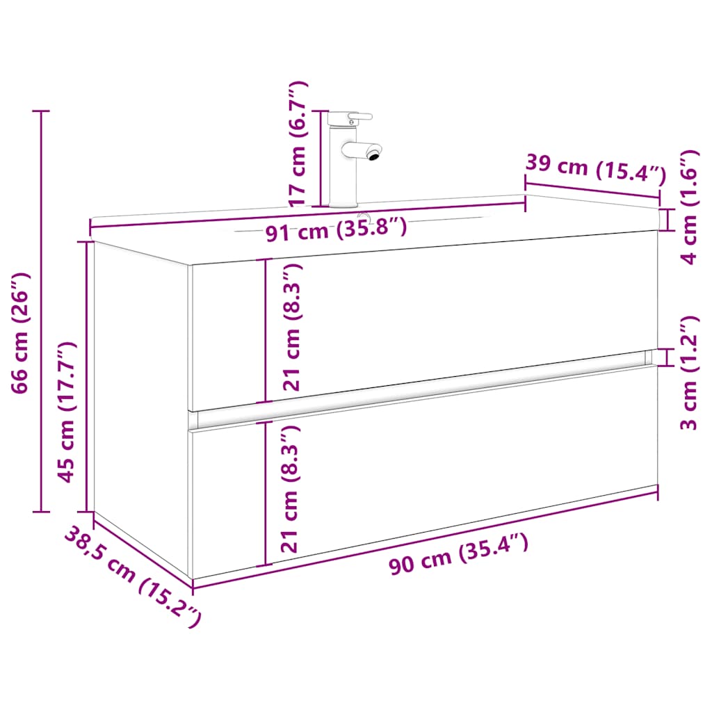 This stylish sink cabinet with a built-in basin and faucet, featuring spacious storage space, is an excellent addition to your bathroom, giving it a tidy and striking appearance! Sturdy material: The under sink cabinet is made of, that is of exceptional quality with smooth surface and also features strength, stability and resistance to moisture.Ample storage: The bathroom sink unit features a drawer, offering ample storage space to store items in your bathroom.Practical design: The top of this bathroom cabinet is ideal for placing the sink.Wall-mounted function: The bathroom cabinet can be wall-mounted to add extra storage space. That way, you can maximise your floor space and keep the area clean.Overflow function: An overflow is also equipped to flow water out when it gets too full. Good to know:Screw(s) and plug(s) for inside the wall are not included. Seek and use screw(s) and plug(s) suitable for your walls. If you are uncertain, seek professional advice. Read and follow each step of the instruction carefully.The faucet and push drainer with overflow function are included.The tap is a hot and cold tap, and if you have a need for hot water, a water heater must be connected.
