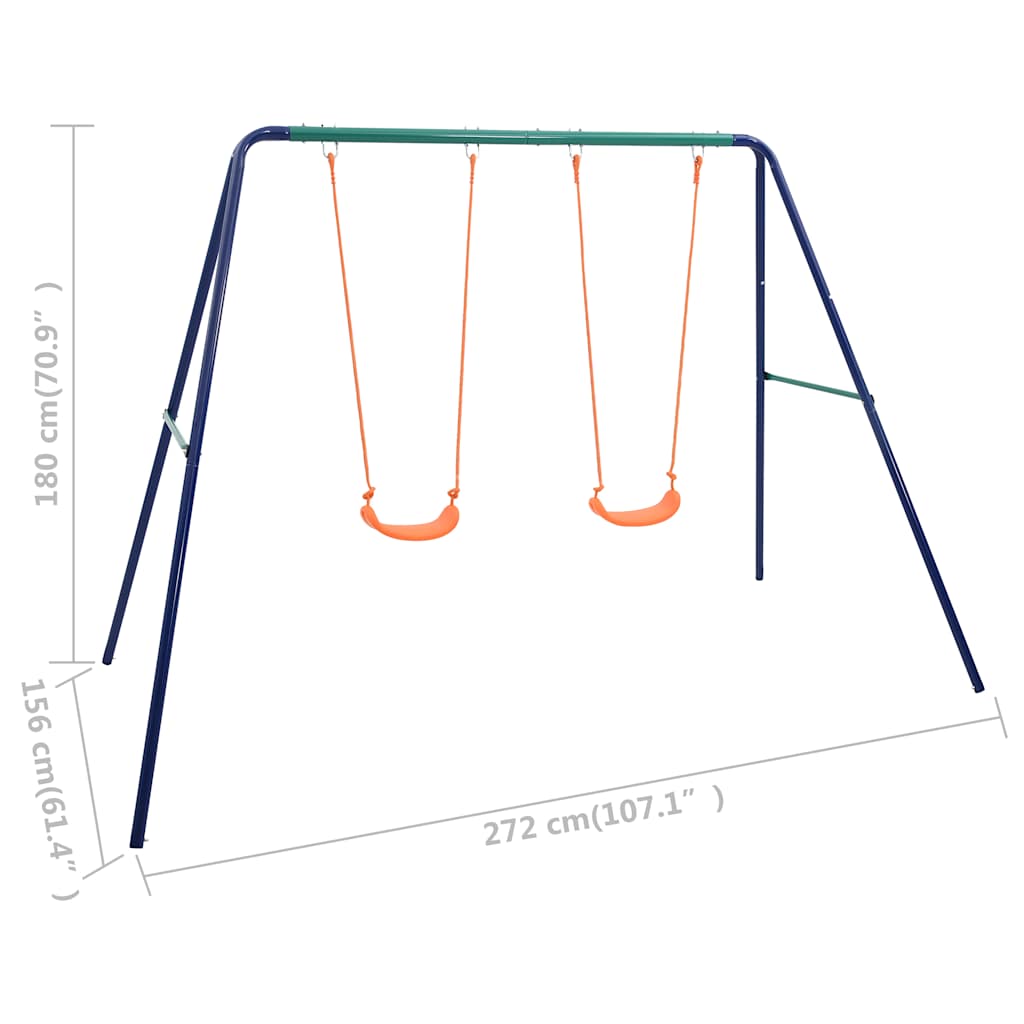 Playing on this swing set will be your children's favourite outdoor activity! Maximum 2 kids can play while enjoying a fresh breeze or a sunny day simultaneously. This swing set consists of a sturdy steel A-frame with 2 single swing seats. Thanks to its sturdy steel frame and plastic seats, the set is extremely durable and weather-resistant. It is also easy to assemble. All swings are securely fixed to the sturdy A-frame crossbar with sturdy brackets, bolts, hooks and ropes. The ground pins and all the necessary installation accessories are included in the delivery. Warning:This product is intended for use by children from ages 3 to 10.Risk of serious head injury or death from a fall from a device placed on a hard surface.Risk of using helmets and other items that can wrap around a child's neck, become entangled or entrapped by the playground, and lead to strangulation or death.