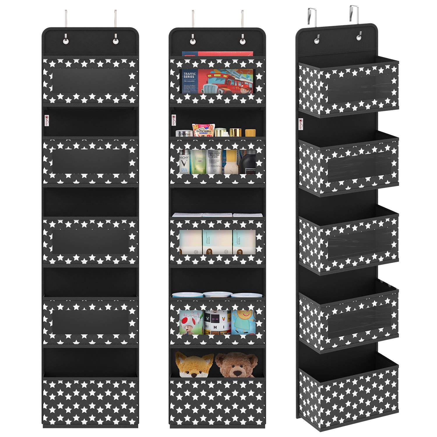 EASY INSTALLATION: Simply stuff the cardboard plates into each pocket and hook it to the door to create vertical storage space. This set includes two metal hooks, side and base plates for the bottom of all pockets to give them a strong enough shape and to aid in the storage of items. Over the door hanging storage can be hung not only on doors and shelves, but also on the wall with nails or through the wear-resistant holes in the hooks.