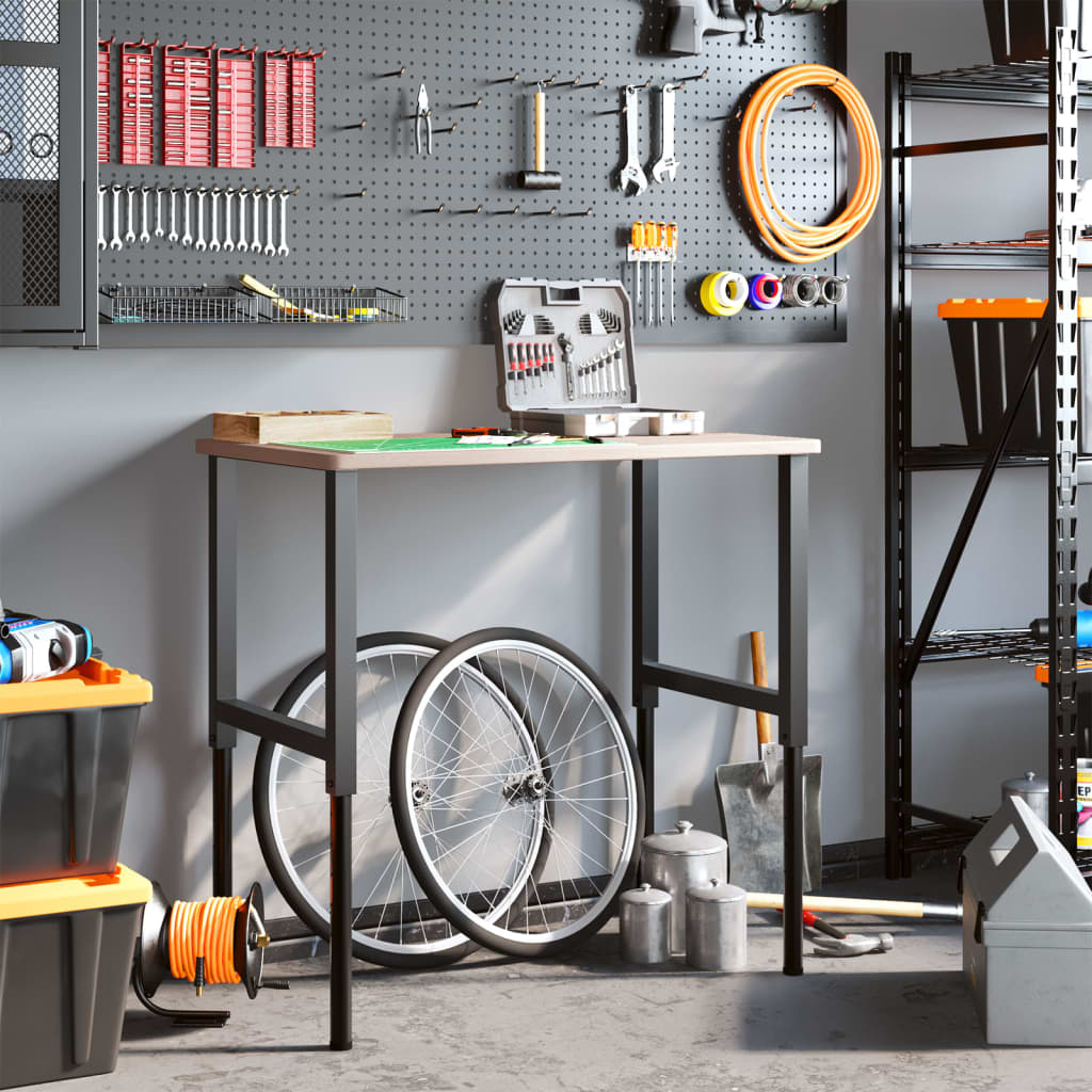 The workbench is a great helper whether you want to finish repair work or fulfil your DIY dreams! Robust and durable material: Solid oak wood is known for its strength, durability, and beautiful grain pattern, making it great for long-lasting furniture. Its natural resistance to insects and fungi ensures that oak furniture remains attractive and functional for years.Stable and long-lasting frame: The powder-coated metal frame is strong, stable, durable, and resistant to corrosion and harsh weather, ensuring long-lasting performance.Large working area: The work table provides a large working area to place your drills, cable drums, and other tool accessories.Versatile use: Features a simple and clean design, you can use it as a tool bench or work desk according to your needs. The workstation is meant to be a practical and convenient piece of furniture.Height-adjustable leg: This wooden workbench leg is height-adjustable so you can customise it according to your preferences. Good to know:Each item is unique with variations in colours and grains. The delivery is random, ensuring the exclusivity and individuality of your product. Warning:This tabletop has no predrilled holes and screws are not included. Therefore holes have to be predrilled, and screws have to be purchased before assembling this work table.