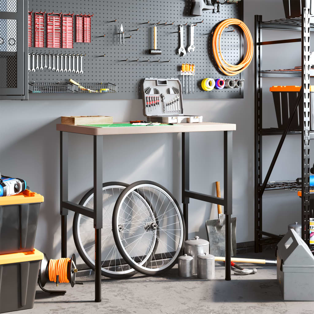 The workbench is a great helper whether you want to finish repair work or fulfil your DIY dreams! Robust and durable material: Solid oak wood is known for its strength, durability, and beautiful grain pattern, making it great for long-lasting furniture. Its natural resistance to insects and fungi ensures that oak furniture remains attractive and functional for years.Stable and long-lasting frame: The powder-coated metal frame is strong, stable, durable, and resistant to corrosion and harsh weather, ensuring long-lasting performance.Large working area: The work table provides a large working area to place your drills, cable drums, and other tool accessories.Versatile use: Features a simple and clean design, you can use it as a tool bench or work desk according to your needs. The workstation is meant to be a practical and convenient piece of furniture.Height-adjustable leg: This wooden workbench leg is height-adjustable so you can customise it according to your preferences. Good to know:Each item is unique with variations in colours and grains. The delivery is random, ensuring the exclusivity and individuality of your product. Warning:This tabletop has no predrilled holes and screws are not included. Therefore holes have to be predrilled, and screws have to be purchased before assembling this work table.
