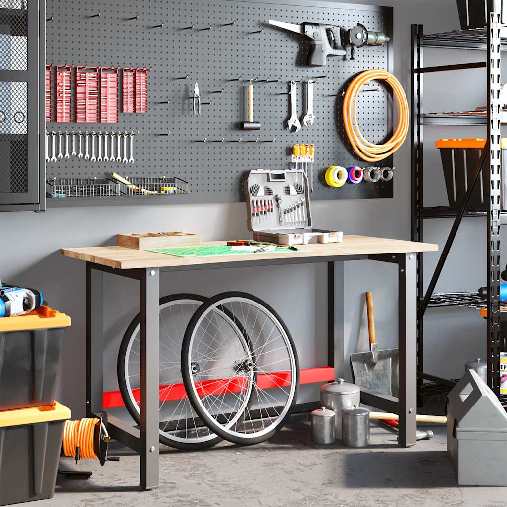 The workbench is a great helper whether you want to finish repair work or fulfil your DIY dreams! Robust and stable material: Solid oak wood is known for its strength, durability, and beautiful grain pattern, making it great for long-lasting furniture. Its natural resistance to insects and fungi ensures that oak furniture remains attractive and functional for years.Stable and long-lasting frame: The powder-coated metal frame is strong, stable, durable, and resistant to corrosion and harsh weather, ensuring long-lasting performance.Large working area: The work table provides a large working area to place your drills, cable drums, and other tool accessories.Versatile use: Features a simple and clean design, you can use it as a tool bench or work desk according to your needs. The workstation is meant to be a practical and convenient piece of furniture. Good to know:Each item is unique with variations in colours and grains. The delivery is random, ensuring the exclusivity and individuality of your product.We recommended using a screwdriver instead of an electric drill to avoid wood cracking when attaching the legs. Warning:This tabletop has no predrilled holes and screws are not included. Therefore holes have to be predrilled, and screws have to be purchased before assembling this work table.