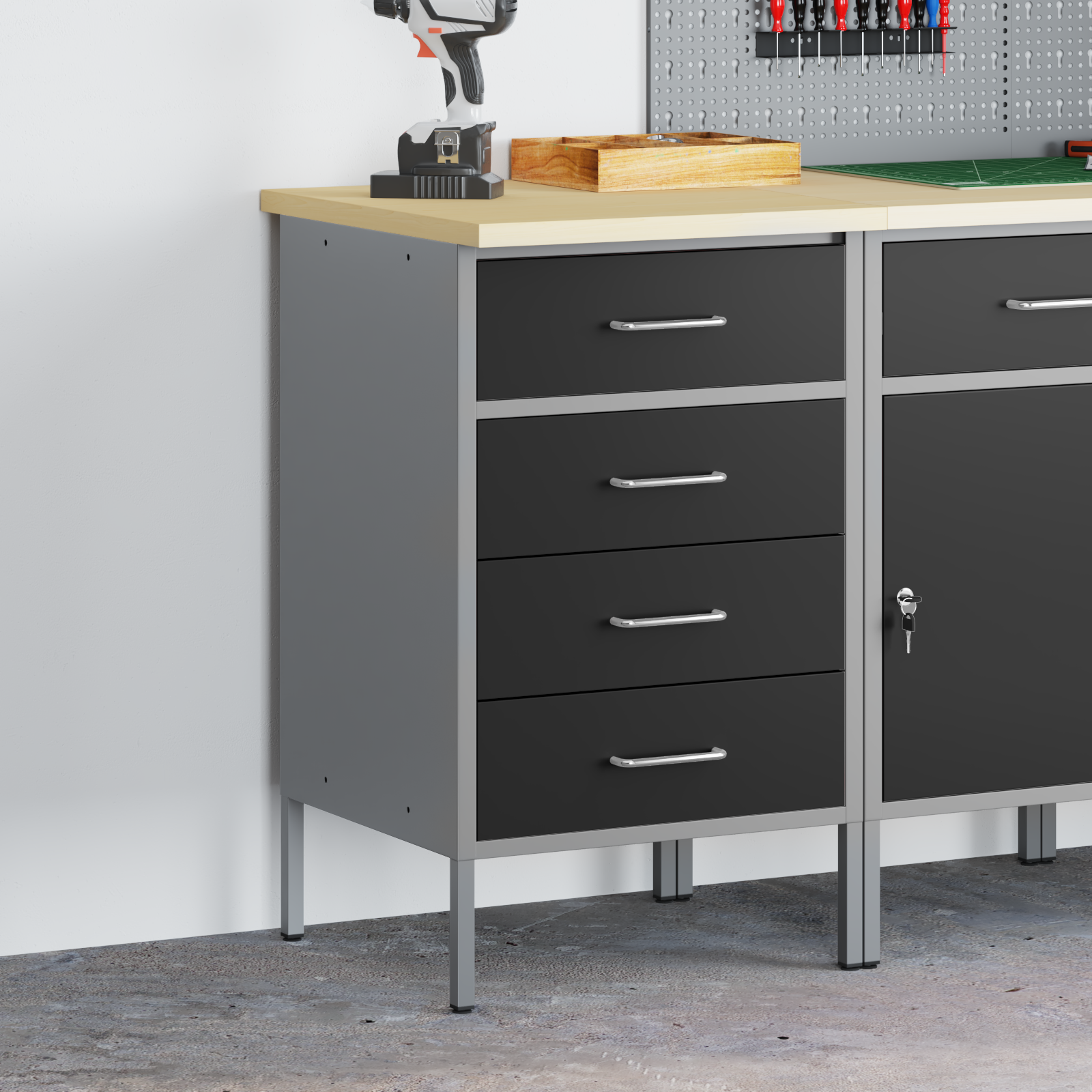 If you're after a sturdy and flexible workspace, the Industrial Steel Workbench is just the ticket. Its industrial style gives any workshop or garage a trendy vibe reminiscent of lofts and warehouses. With its sleek matte finish, it fits right in and is tough enough to handle heavy use, thanks to the powder-coated steel. You can count on it to keep your tools organized and ready to go! Materials: Made from high-quality powder-coated steel, this workbench is built to last and resistant to wear and tear. The durable finish keeps it looking sharp over time, making it perfect for any workshop or garage. With wood accents, it brings together strength and style. Included Components: This workbench is designed for organization and doesn't come with drawers or shelves. Instead, it offers loads of tabletop space for easy tool access, which keeps everything within reach and boosts your workflow. Features / Function / Design: The adjustable feet make it ideal for uneven flooring, giving you stability while you work. Its industrial vibe pays tribute to raw urban styles, making it a great choice for spaces that love a rugged look. Plus, the matte finish looks good while being functional. Recommended Uses: Ideal for any workshop or garage, this workbench is perfect for all sorts of projects. Whether you’re a pro or a DIY enthusiast, it provides a reliable surface for getting things done. Care & Maintenance: Keeping it in good shape is easy—just give the matte surface a quick wipe with a damp cloth to maintain its look and longevity. Avoid harsh chemicals to keep that finish intact so you can rely on it for years to come.