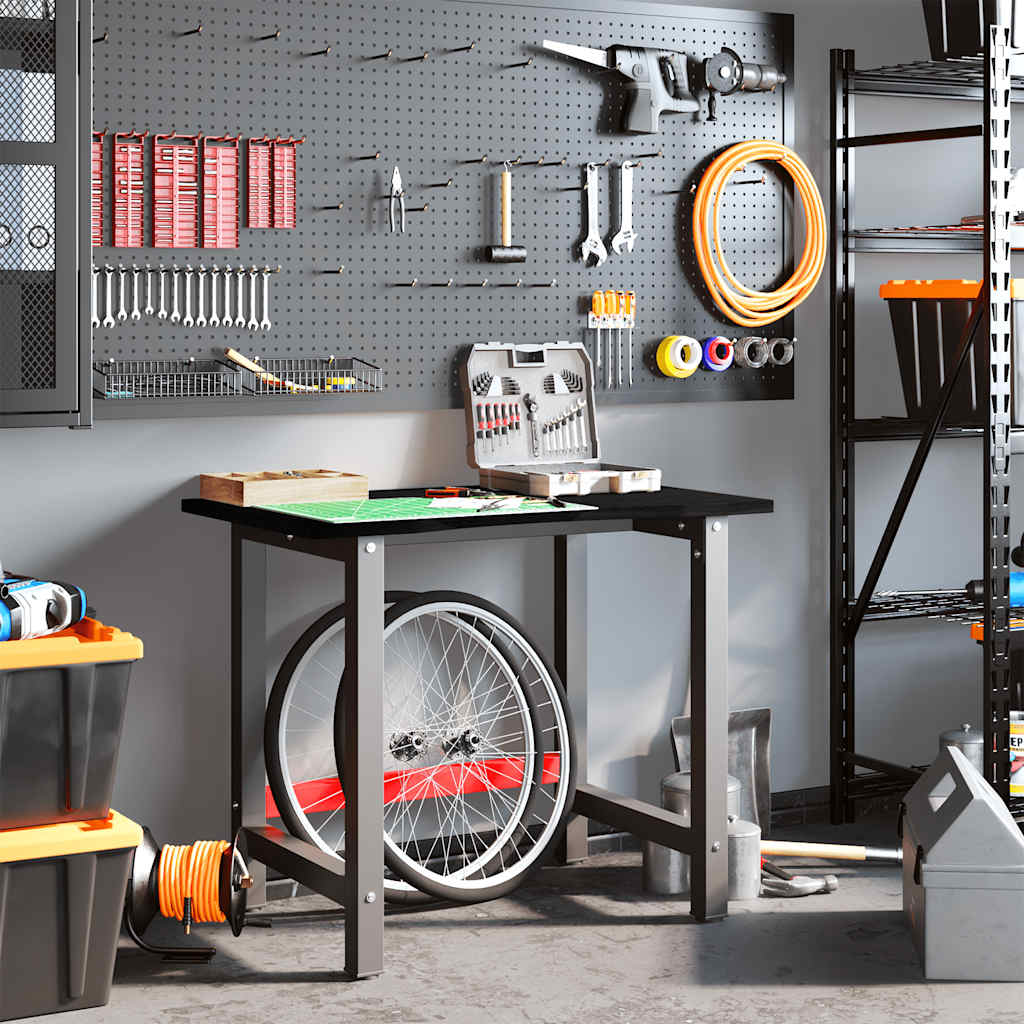 The workbench is a great helper whether you want to finish repair work or fulfil your DIY dreams! Robust and stable material: Solid oak wood is known for its strength, durability, and beautiful grain pattern, making it great for long-lasting furniture. Its natural resistance to insects and fungi ensures that oak furniture remains attractive and functional for years.Stable and long-lasting frame: The powder-coated metal frame is strong, stable, durable, and resistant to corrosion and harsh weather, ensuring long-lasting performance.Large working area: The work table provides a large working area to place your drills, cable drums, and other tool accessories.Versatile use: Features a simple and clean design, you can use it as a tool bench or work desk according to your needs. The workstation is meant to be a practical and convenient piece of furniture. Good to know:Each item is unique with variations in colours and grains. The delivery is random, ensuring the exclusivity and individuality of your product.We recommended using a screwdriver instead of an electric drill to avoid wood cracking when attaching the legs. Warning:This tabletop has no predrilled holes and screws are not included. Therefore holes have to be predrilled, and screws have to be purchased before assembling this work table.