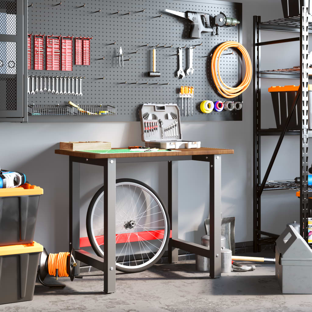 The workbench is a great helper whether you want to finish repair work or fulfil your DIY dreams! Robust and durable material: Solid oak wood is known for its strength, durability, and beautiful grain pattern, making it great for long-lasting furniture. Its natural resistance to insects and fungi ensures that oak furniture remains attractive and functional for years.Stable and long-lasting frame: The powder-coated metal frame is strong, stable, durable, and resistant to corrosion and harsh weather, ensuring long-lasting performance.Large working area: The work table provides a large working area to place your drills, cable drums, and other tool accessories.Versatile use: Features a simple and clean design, you can use it as a tool bench or work desk according to your needs. The workstation is meant to be a practical and convenient piece of furniture. Good to know:Each item is unique with variations in colours and grains. The delivery is random, ensuring the exclusivity and individuality of your product. Warning:This tabletop has no predrilled holes and screws are not included. Therefore holes have to be predrilled, and screws have to be purchased before assembling this work table.