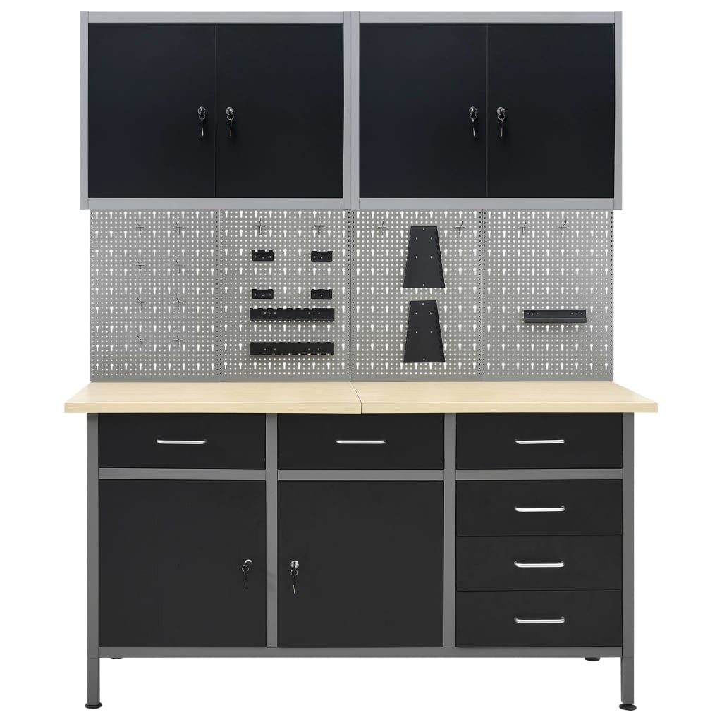 This set is combined with 1 workbench, 4 wall panels and 2 wall cabinets, which will make a practical storage solution to your workshop and garage. The heavy-duty workbench, standing out with ample storage space and 500 kg loading capacity. This large and sturdy tabletop provides a stable platform for all your repair works. The workbench has 6 drawers, to organize your tools, parts and accessories such as screws, nails and adhesive tape properly. All drawers are equipped with ball bearing mechanism for smooth sliding. There are 2 shelves and a large compartment with 2 lockable doors, which can easily accommodate drills, cable drums and grinders. Additionally, the feet are height-adjustable. This workstation is crafted from premium steel and engineered wood, making it extra sturdy, durable and easy to clean. It is easy to assemble. These tool panels crafted from solid steel can bear the weight of various tools, like drills, pliers, screwdrivers and wrenches. The panels are perforated for fixing tools easily and securely. The 4 wall panels can be fixed together for extra rigidity. It is an ideal addition to your workbench and workshop cabinets with a practical width of 160 cm. The tool storage unit features two height-adjustable shelves and a perforated plate with holes that can be used to hang various kinds of tools such as spanners, pliers, hammers, etc. Equipped with two lockable doors (2 keys included for each door), this tool cabinet provides extra safety. It is made of metal with an extra strong scratch-proof coating, making it durable and easy to clean. This product needs to be assembled.
