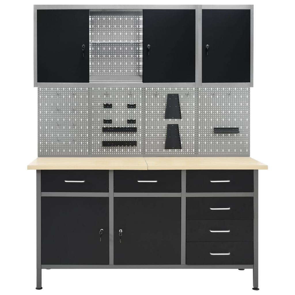 This set is combined with 1 workbench, 4 wall panels and 2 wall cabinets, and make a practical storage solution to your workshop and garage. The heavy-duty workbench, standing out with ample storage space and 500 kg loading capacity. This large and sturdy tabletop provides a stable platform for all your repair works. The workbench has 6 drawers, to organize your tools, parts and accessories such as screws, nails and adhesive tape properly. All drawers are equipped with ball bearing mechanism for smooth sliding. There are 2 shelves and a large compartment with 2 lockable doors, which can easily accommodate drills, cable drums and grinders. Additionally, the feet are height-adjustable. This workstation is crafted from premium steel and engineered wood, making it extra sturdy, durable and easy to clean. It is easy to assemble. These tool panels are crafted from solid steel to bear the weight of various tools, like drills, pliers, screwdrivers and wrenches. These panels are perforated for fixing tools easily and securely. These 4 wall panels can be fixed together for extra rigidity. It is an ideal addition to your workbench and workshop cabinets with a practical width of 160 cm. This set has two tool storage units. The large one features three height-adjustable shelves and a perforated plate with holes. The smaller one features one height-adjustable shelf and a perforated plate with holes to hang various kinds of tools such as spanners, pliers, hammers, etc. This tool cabinet is equipped with one lockable door (2 keys included) to provide extra safety. It is made of metal with an extra-strong scratch-proof coating, making it durable and easy to clean. This product needs to be assembled.